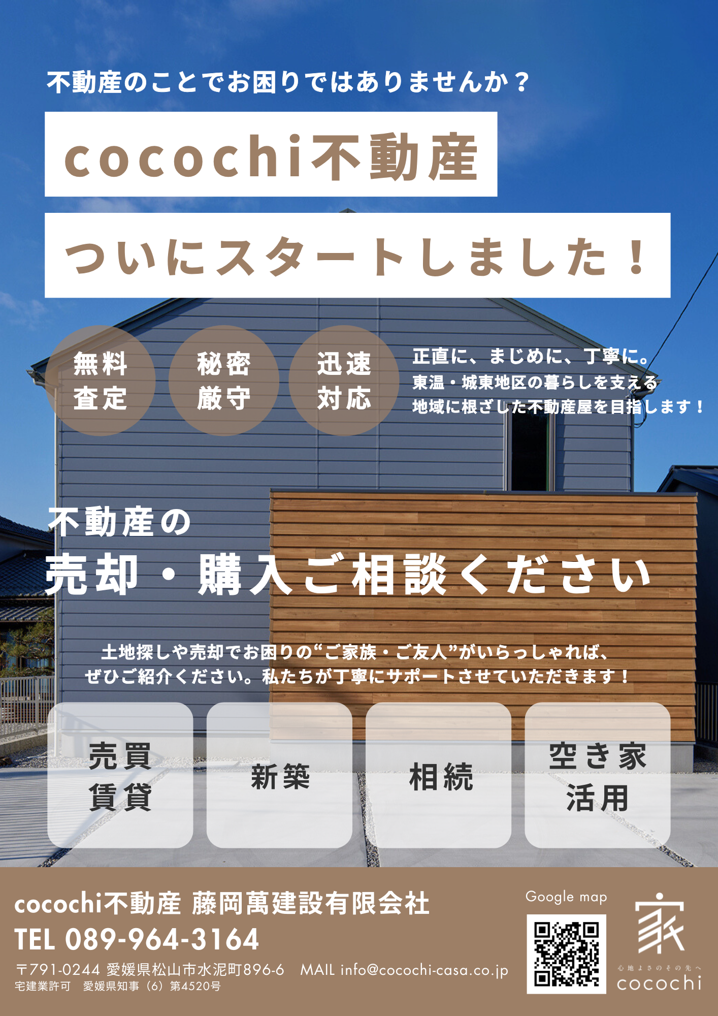 元々、藤岡萬建設は宅建業者でしたが、新たに『cocochi不動産』と言う名前でスタートします!