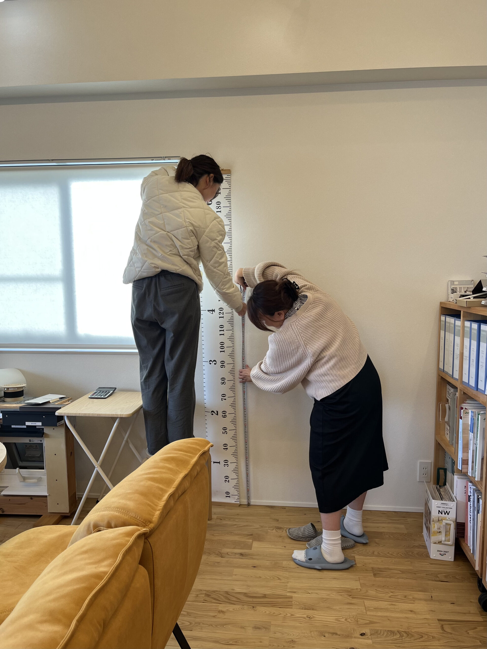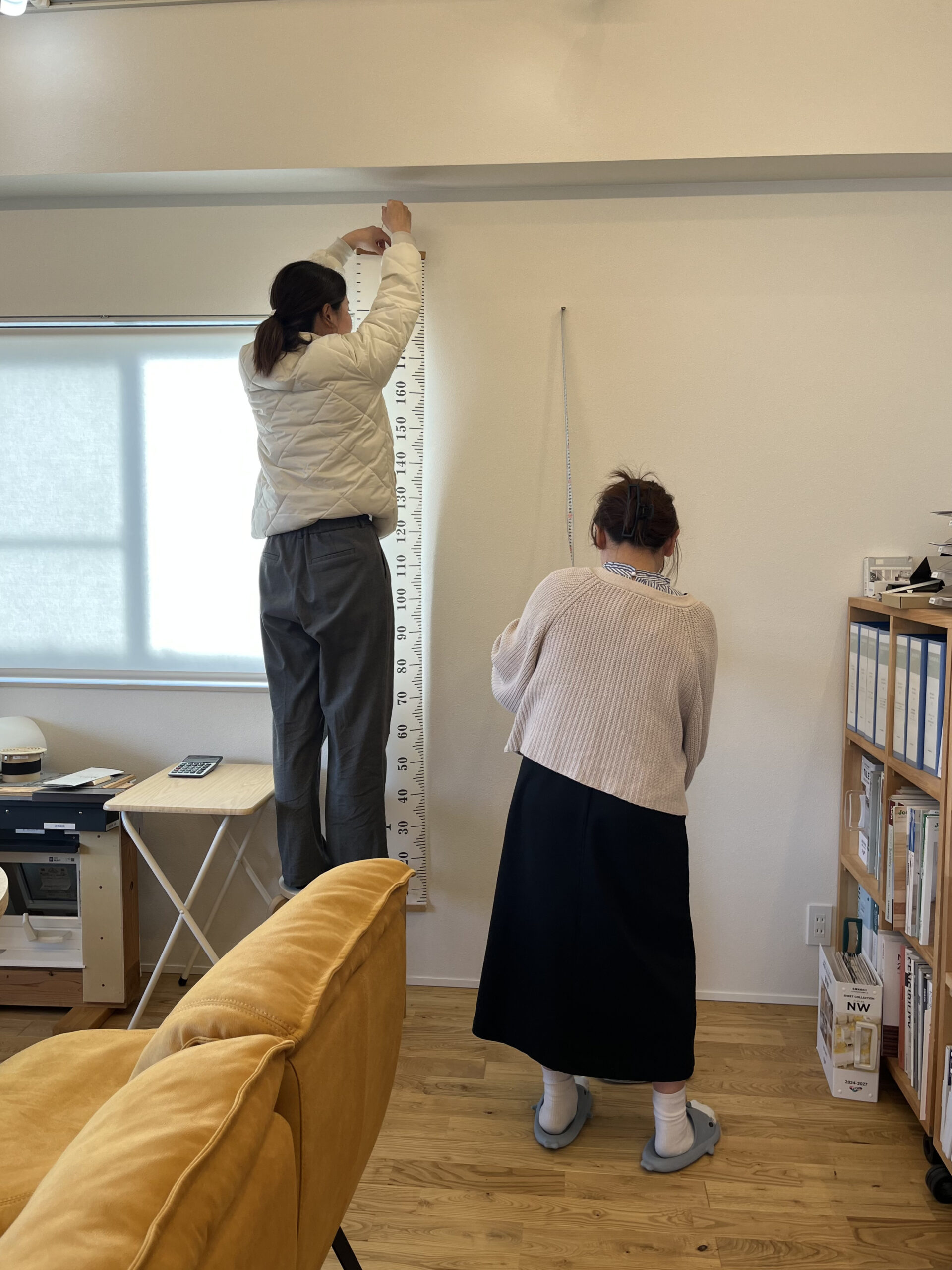 もちろんスケールを使って確認することが多いのですが、こうして実際に壁に目安があるとよりイメージしやすくなるはず✨田中さんと佐々木さんが取り付けてくれました🌿