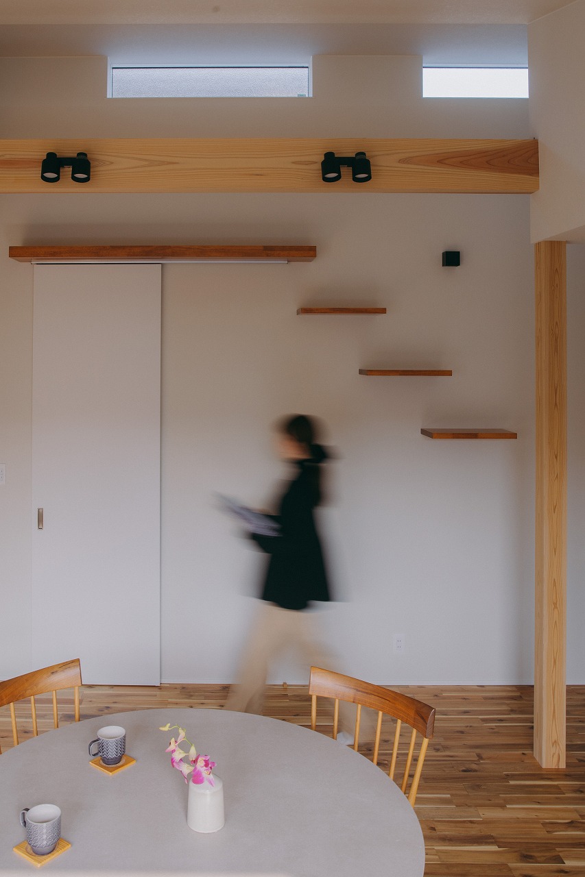 LDKを見下ろす位置に設けたキャットウォーク。猫のための空間でありながら、空間に高さとリズムを生み出す“暮らしを楽しむための仕掛け”です。