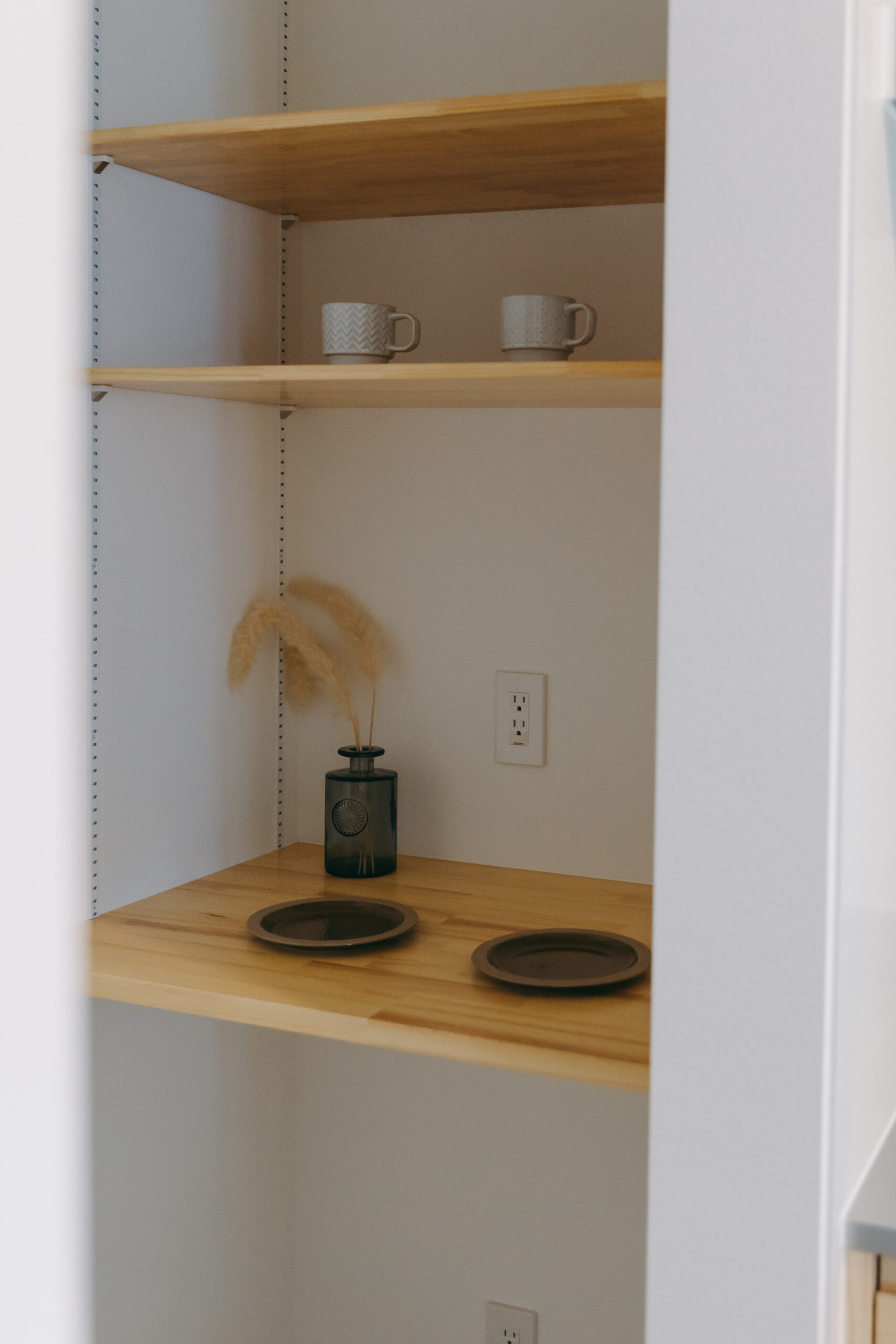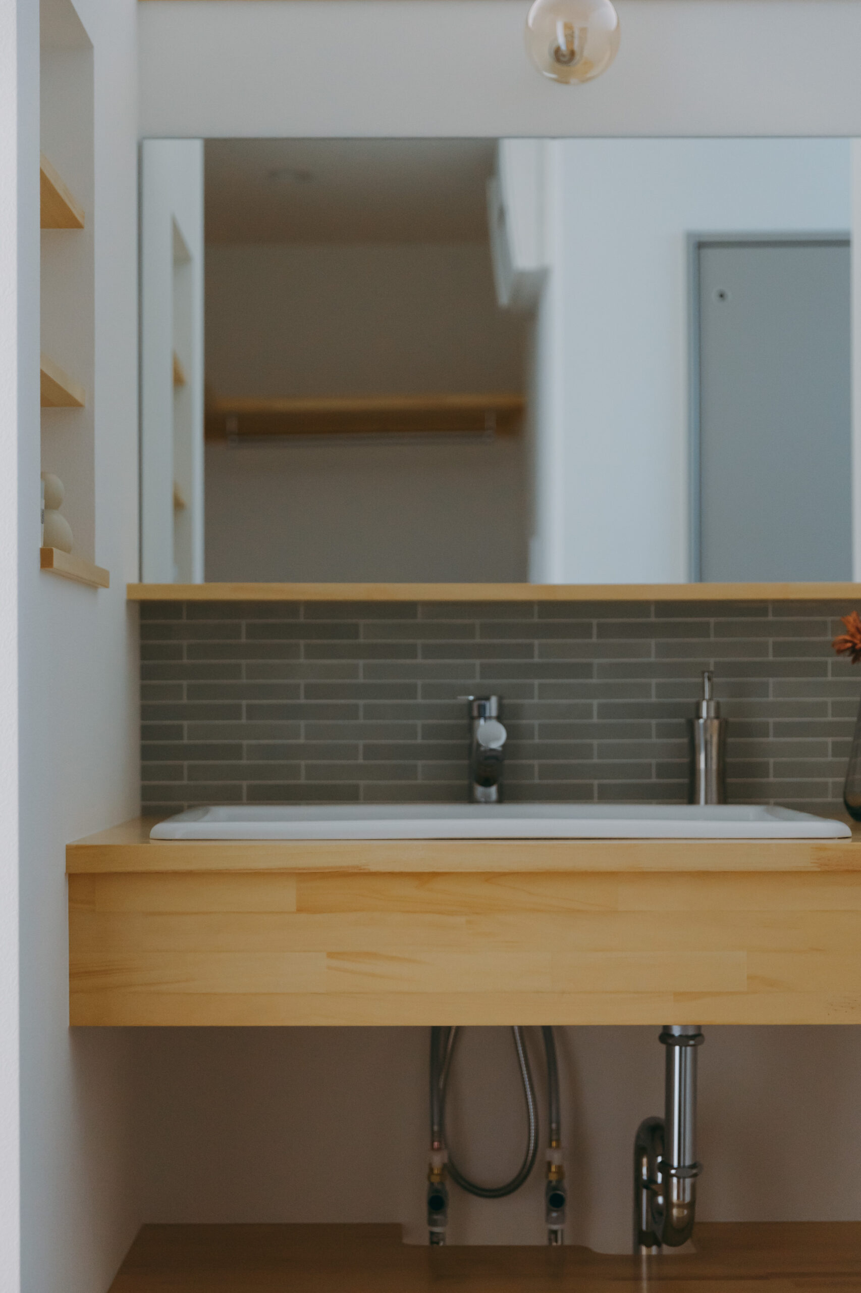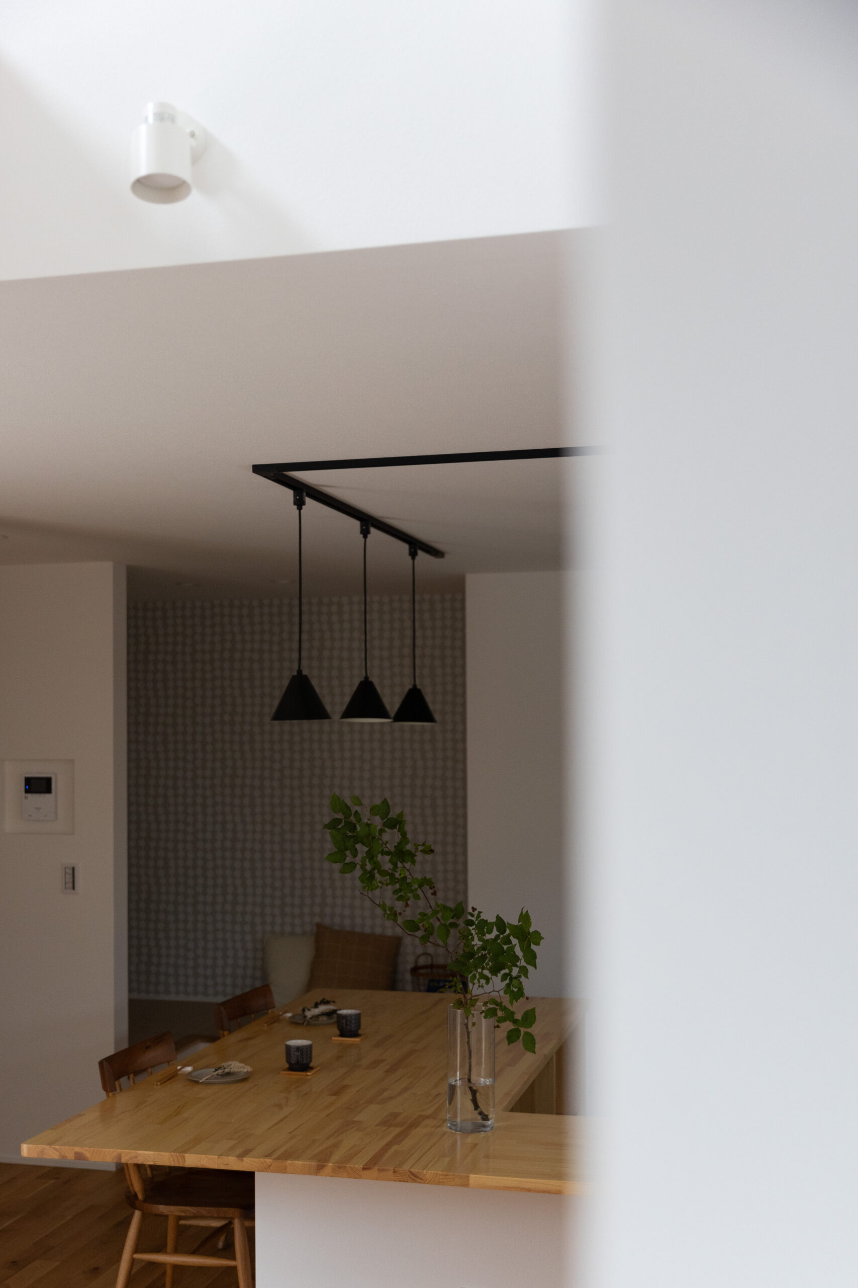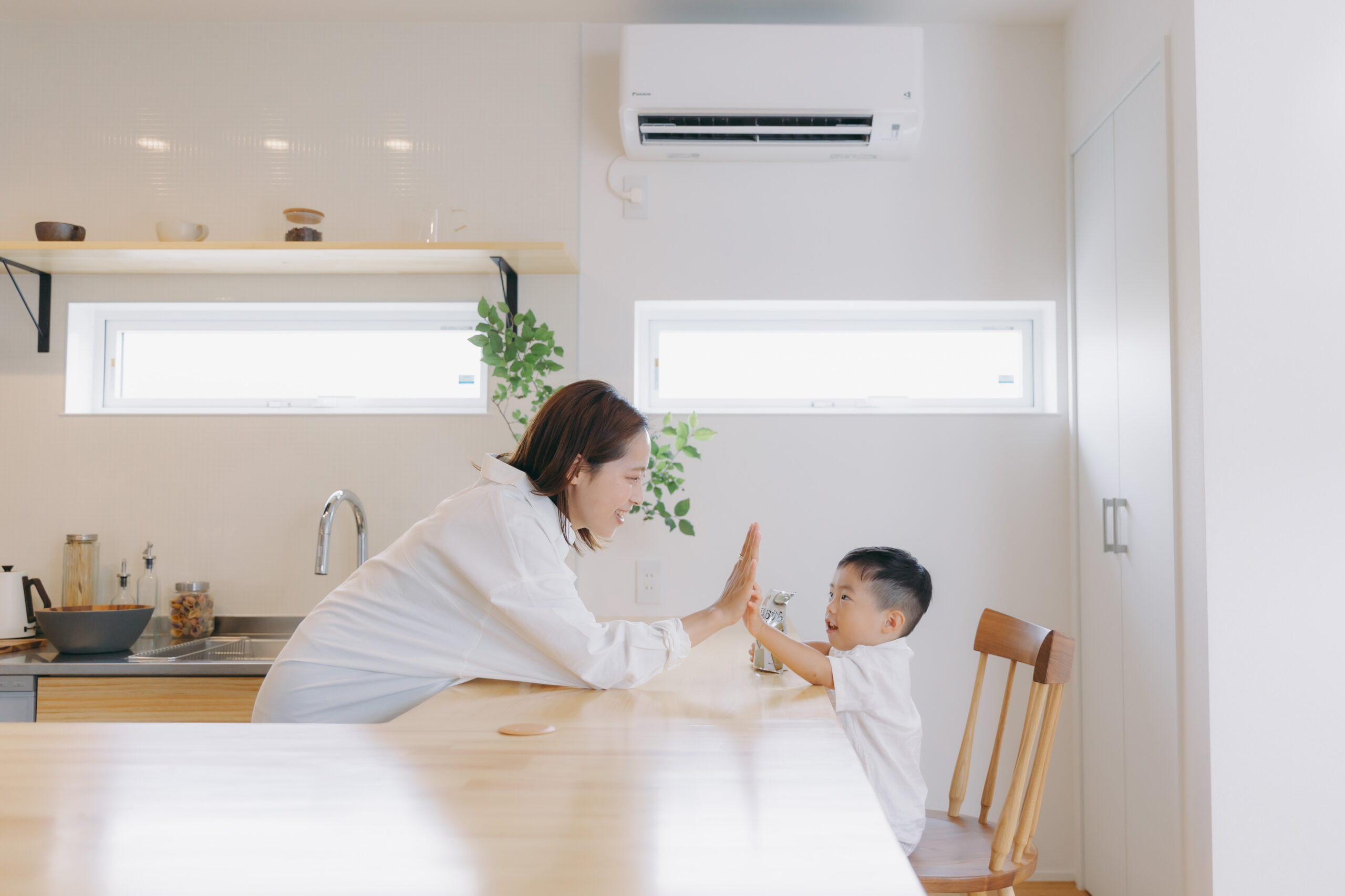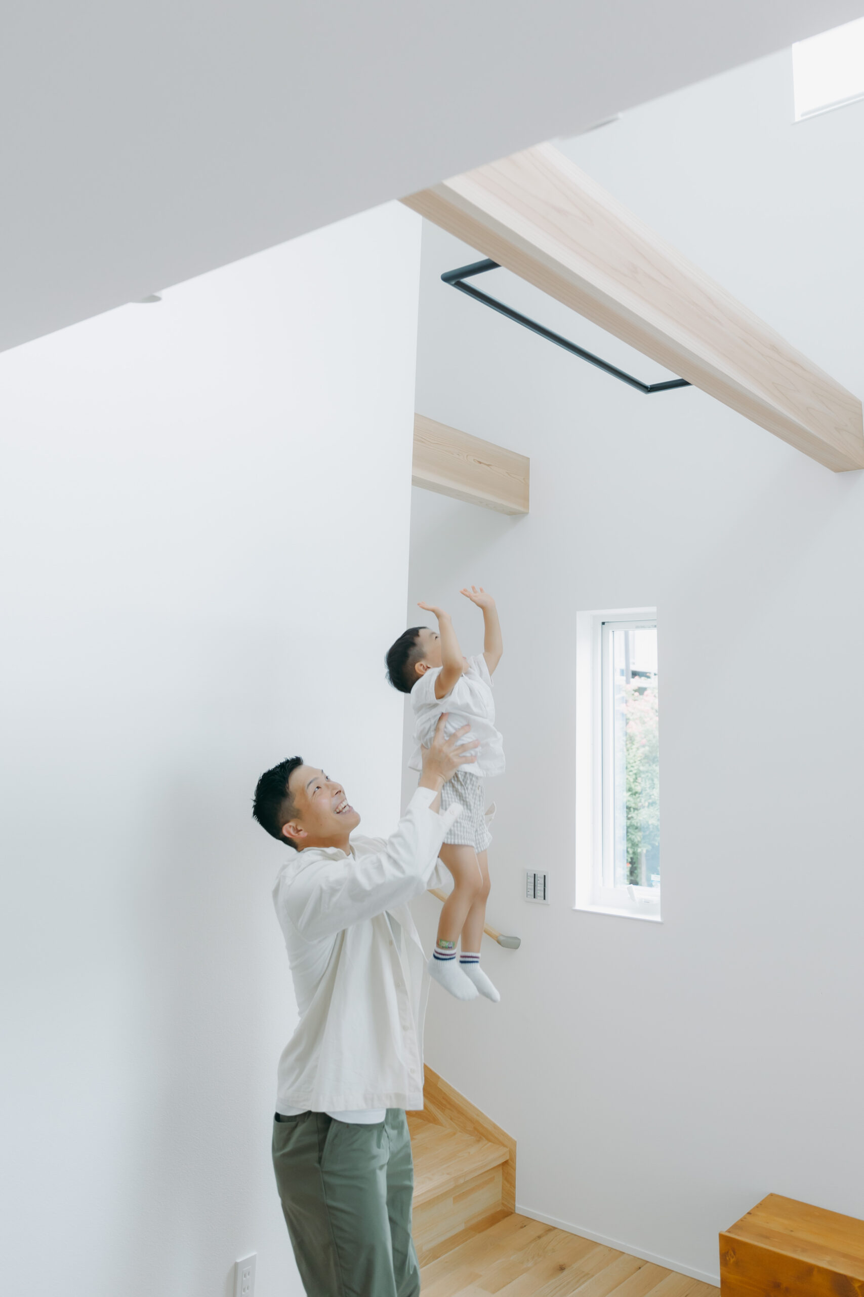 まるでお気に入りのカフェのように、心がほっとする暮らし。LDKの主役は、家族が自然と集まるコの字型キッチン。冷蔵庫はパントリーに隠し、生活感をおさえたすっきりデザインに。床を一段下げてカウンターと高さを揃えることで、配膳も片付けもスムーズに。カウンター越しに交わす会話や視線が、日常をやさしく彩る。吹き抜けのあるリビングには化粧梁と懸垂バーを設け、開放感の中に遊び心をプラス。家の中でも体を動かせる工夫が、家族の笑顔を生み出す。L字に設けた畳コーナーは、腰かけたりごろんと横になったり、くつろぎの余白を感じられる空間に。玄関からLDKへとまっすぐつながる動線は、シンプルで無駄のない設計。高気密・高断熱+澄家換気システムの効果で、どの場所も快適温度をキープしながら過ごせる。「おうち時間」がもっと心地よく、もっと自分らしくなる。そんな想いを叶えた、カフェのようにくつろげる住まいが完成した。