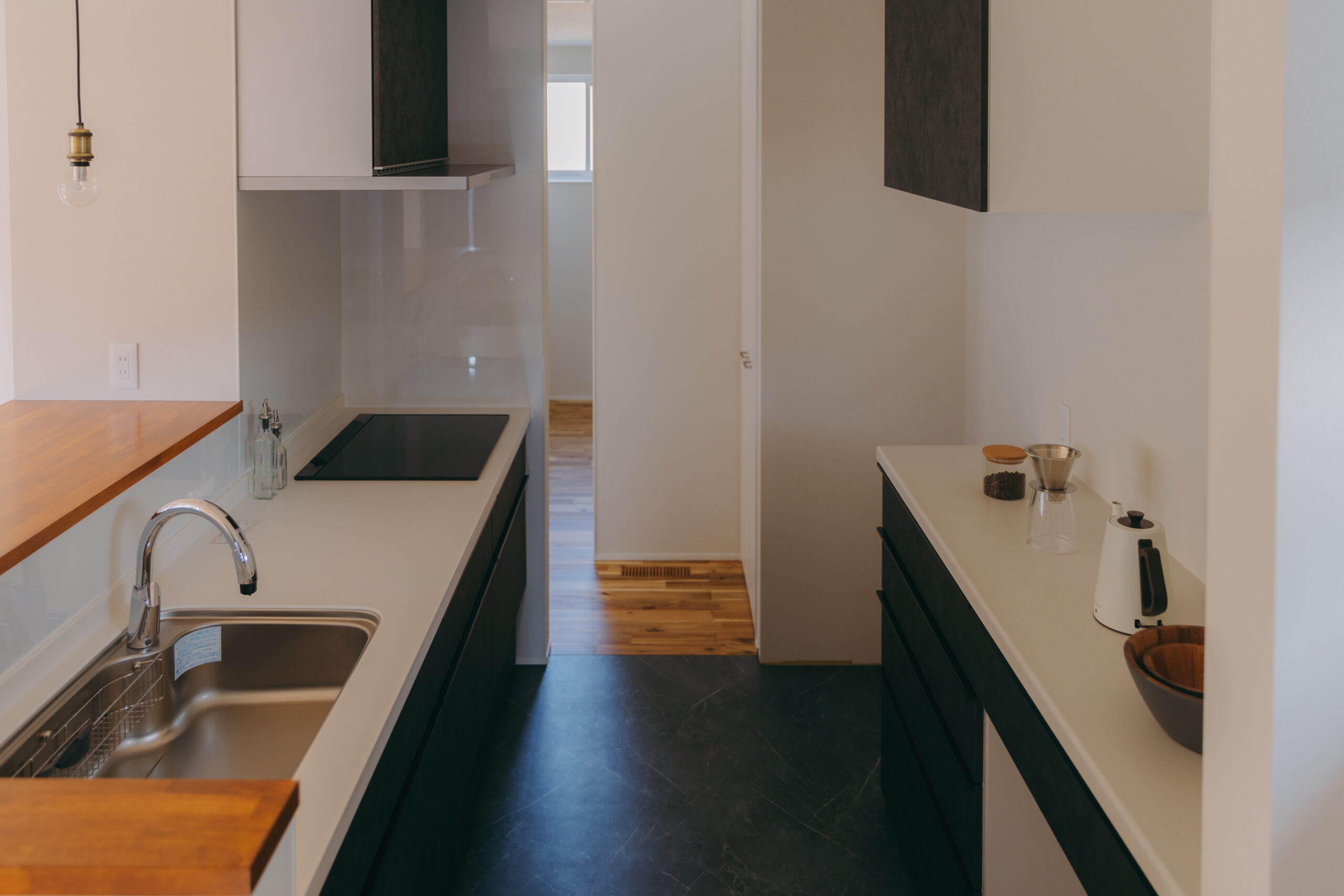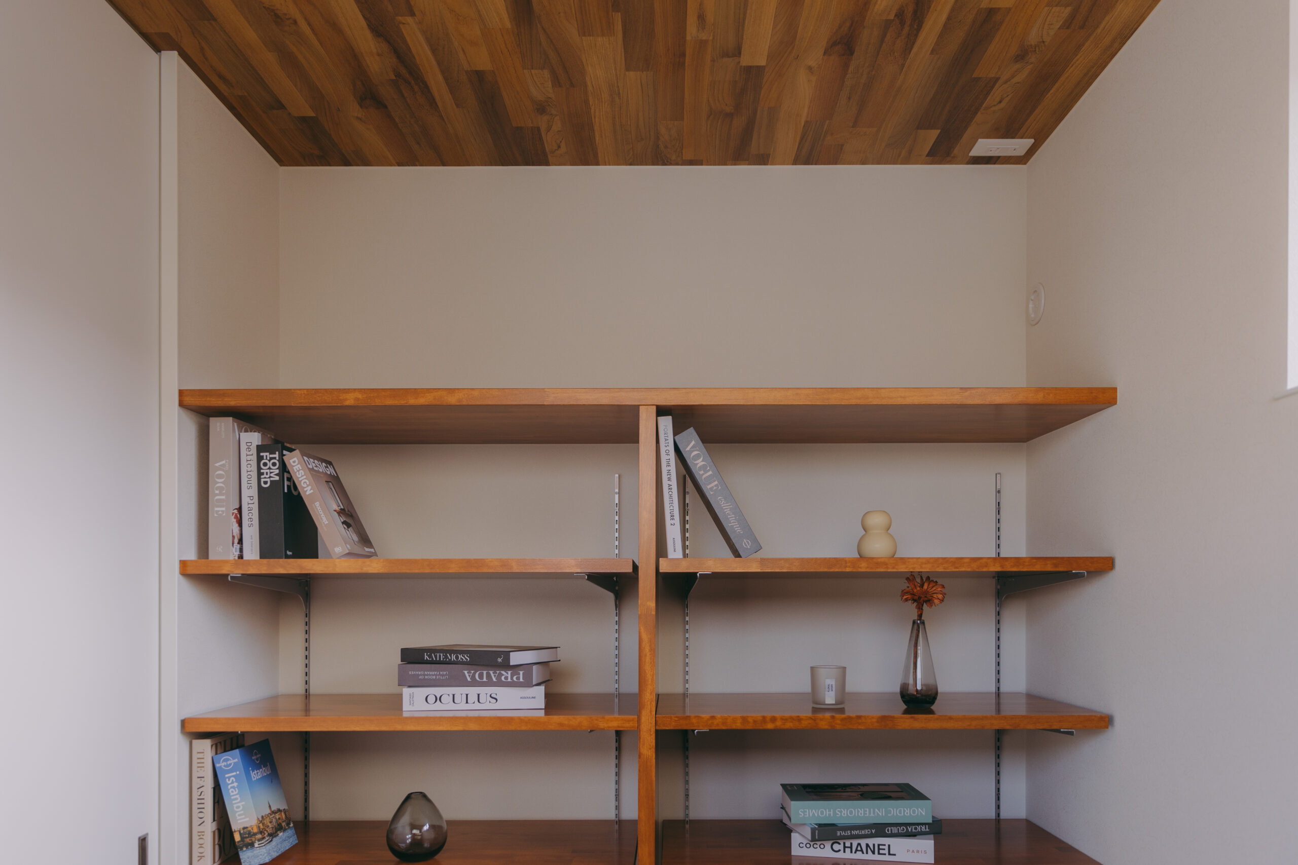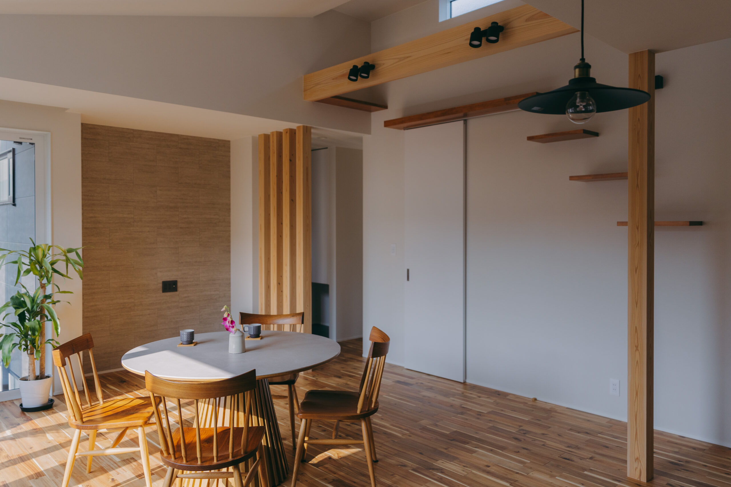 広ければいいわけではない。けれど、窮屈さを感じる家でもない。26坪というサイズの中で追い求めたのは、暮らしに無理をさせない“ちょうどよさ”。個室はコンパクトに整え、その分、23帖のLDKをのびやかに確保した。家族が自然と集まりながらも、それぞれの時間も尊重できる構成。窓辺のヌックやこもれる書斎が、空間に静かな奥行きを生む。高低差を活かしたキャットウォークが視線を上へと導き、住まいに立体的な広がりを与える。限られた面積を、余白へと変える設計。ふたりの時間も、にぎやかな時間も、どちらも心地よく受け止める平屋が完成した。