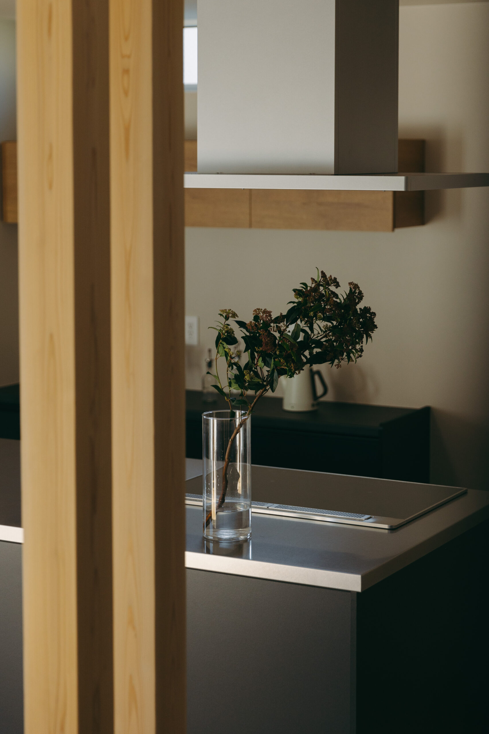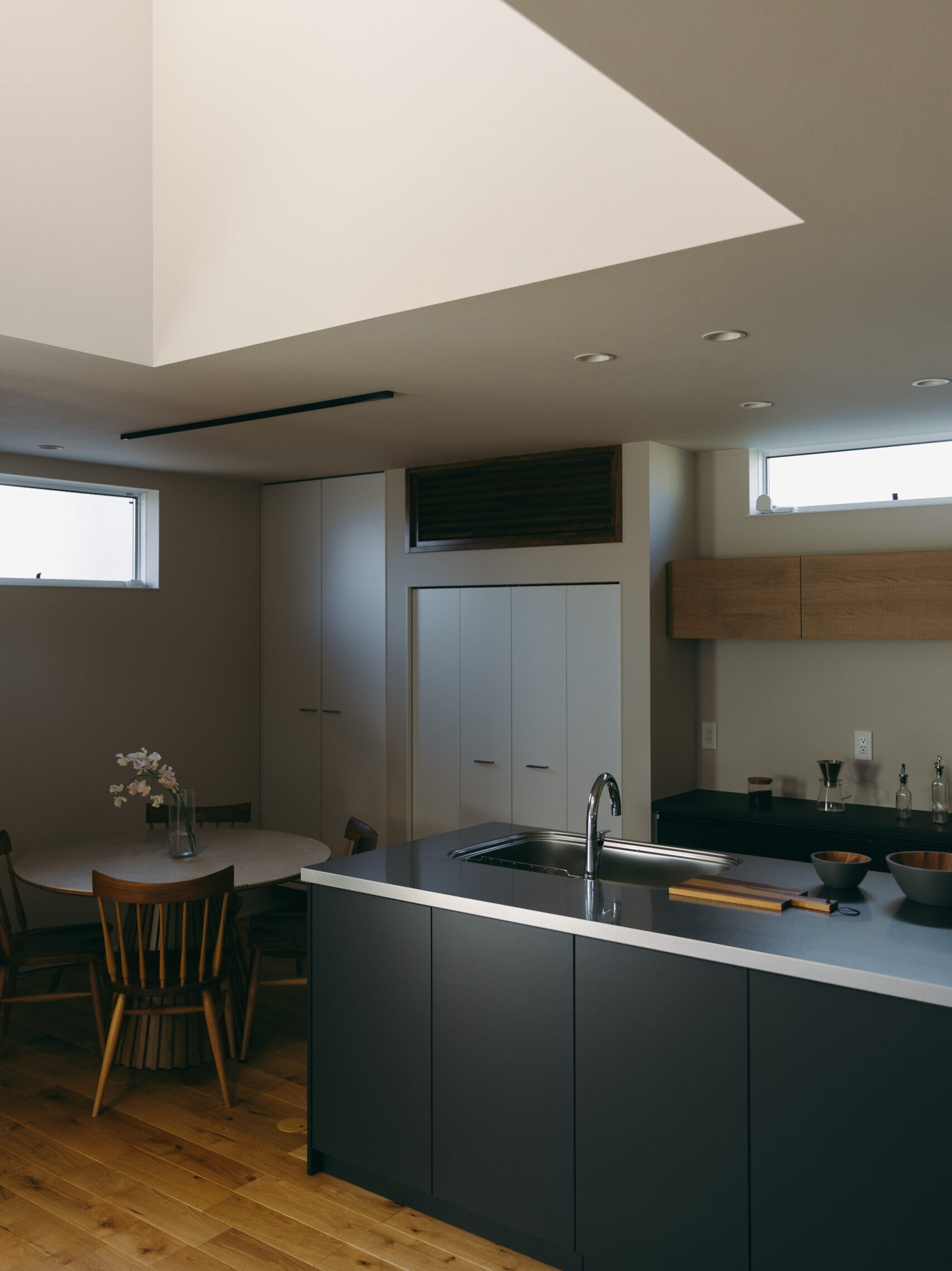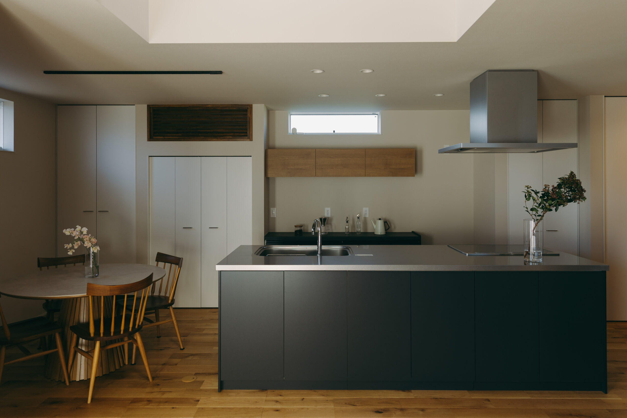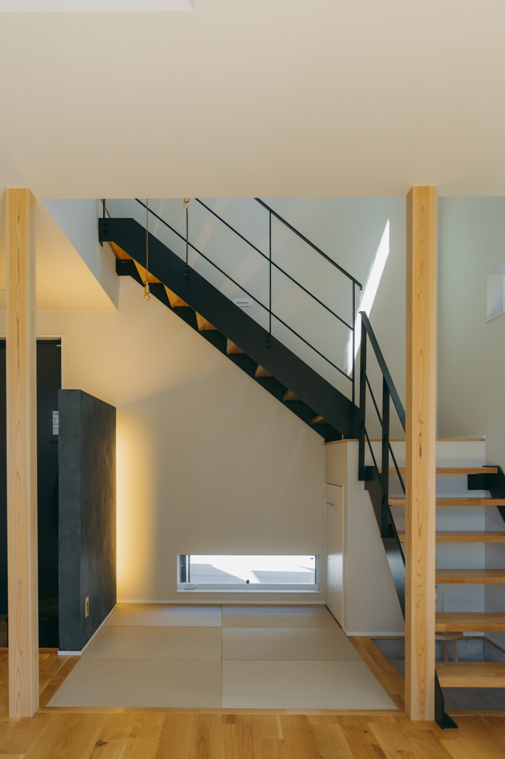 玄関の扉を開けると、そこに廊下はなく、視線の先にはLDKと吹き抜けの光が広がり、空間全体がやわらかく解き放たれる。家のどこにいても家族の気配を感じながら過ごせる。これだけ開放的な空間でありながら、外側と内側から住まいを包み込むダブル断熱によって、夏の熱気や冬の冷気を抑え、家全体を心地よい温度に保つ快適性も両立した。玄関からLDKへとつながる動線に加え、キッチンとダイニングを横並びに配置し、水回りも一直線にまとめることで、日々の動作をシンプルに整え、暮らしにゆとりをもたらしている。玄関正面にはポーターズペイントの腰壁を設け、時を重ねるごとに風合いを深めながら住まいの“顔”として空間に奥行きを添える。さらに、吹き抜けに面した書斎や、畳と土間を組み合わせた余白の空間を設けることで、つながりの中にもそれぞれが心地よく過ごせる居場所をつくり出した。仕切らないことで生まれる一体感と、それを支える確かな性能によって、家族がどこにいても安心して過ごせる住まいが完成した。