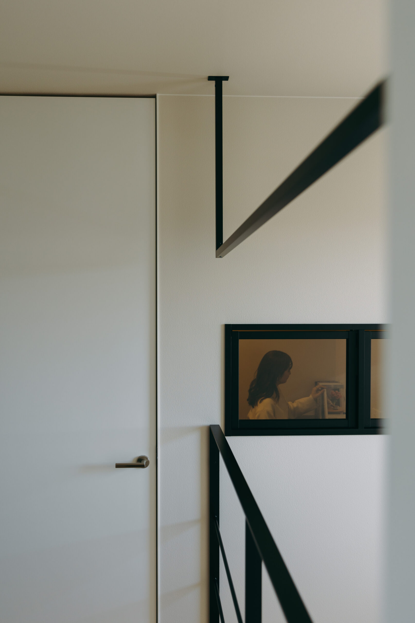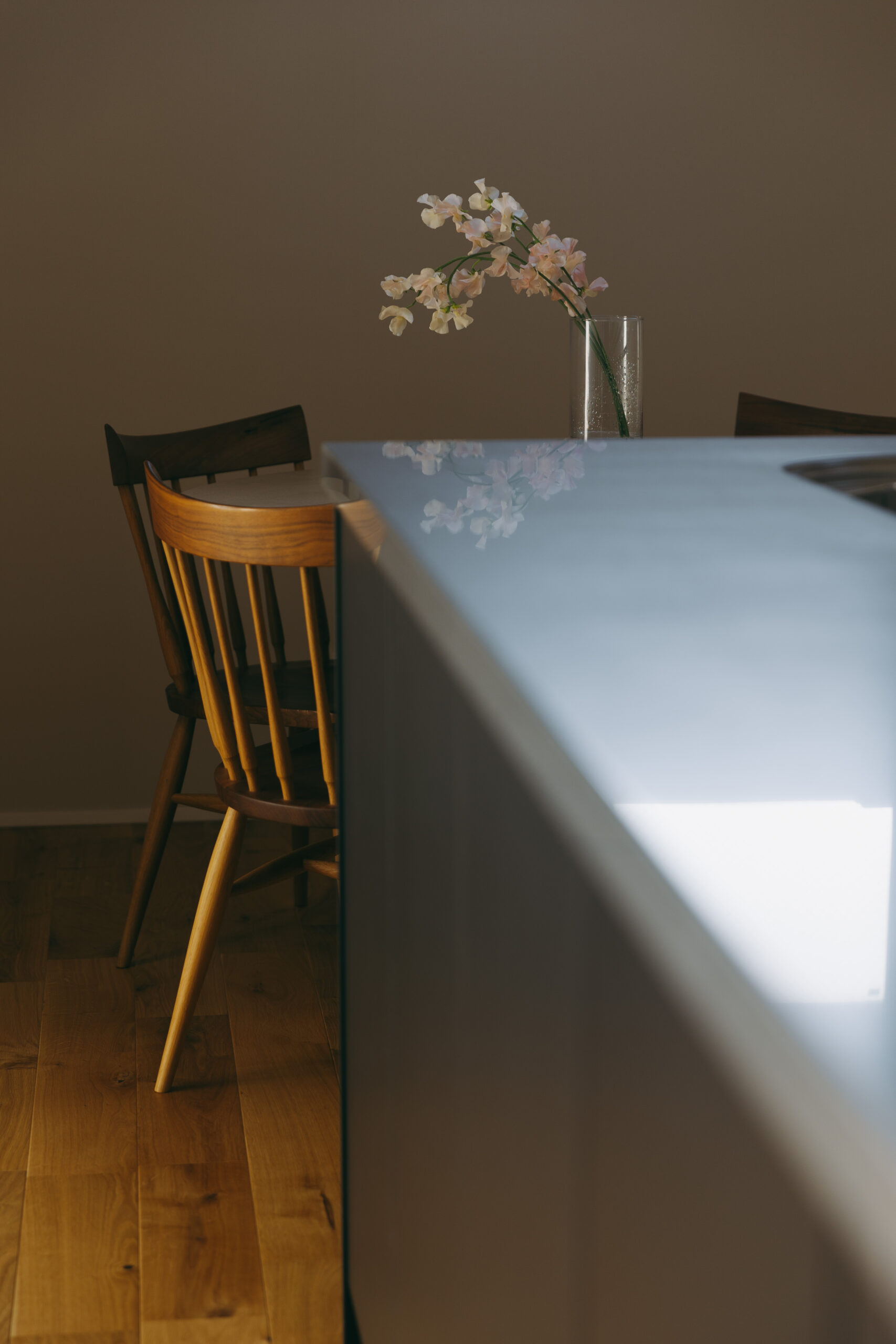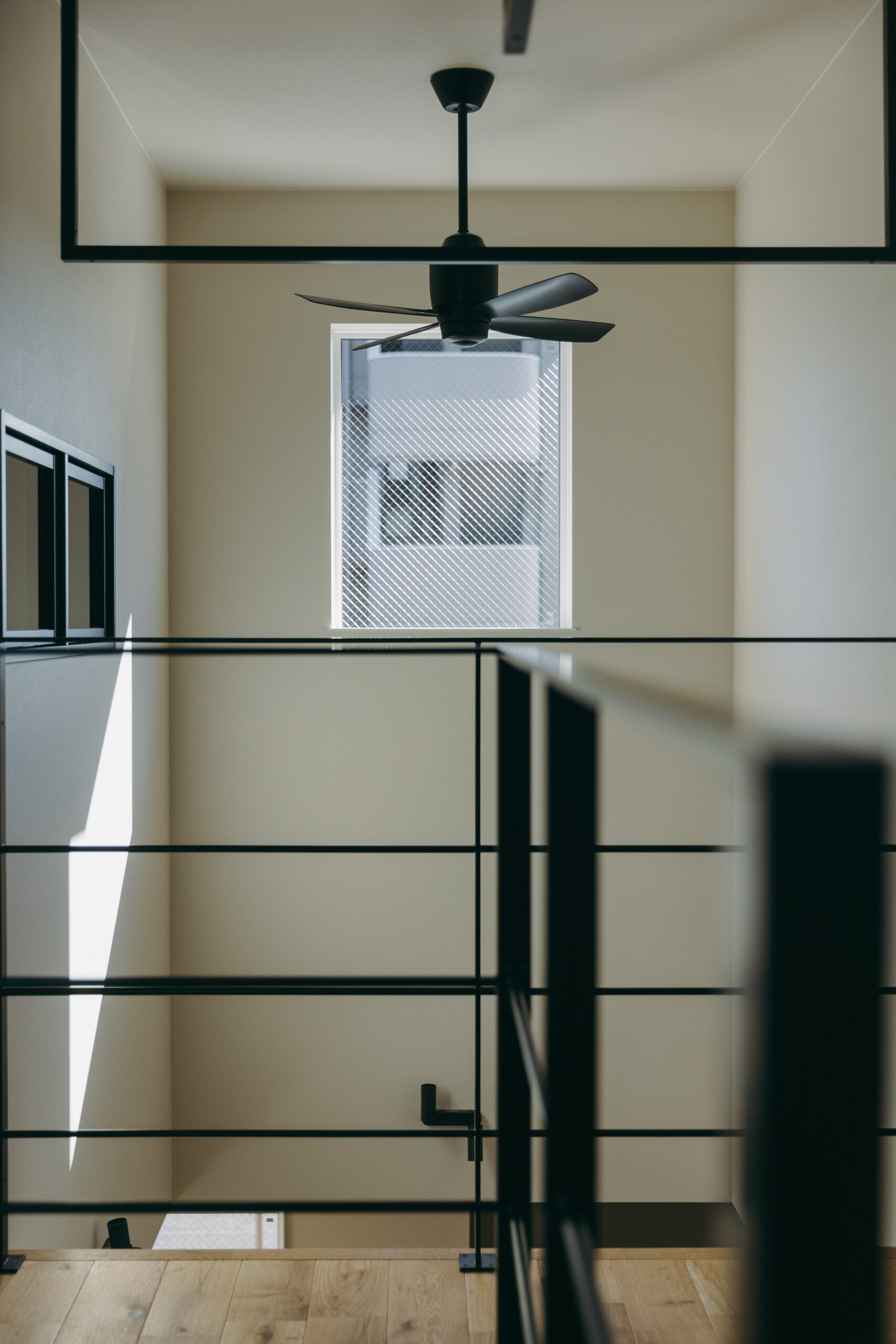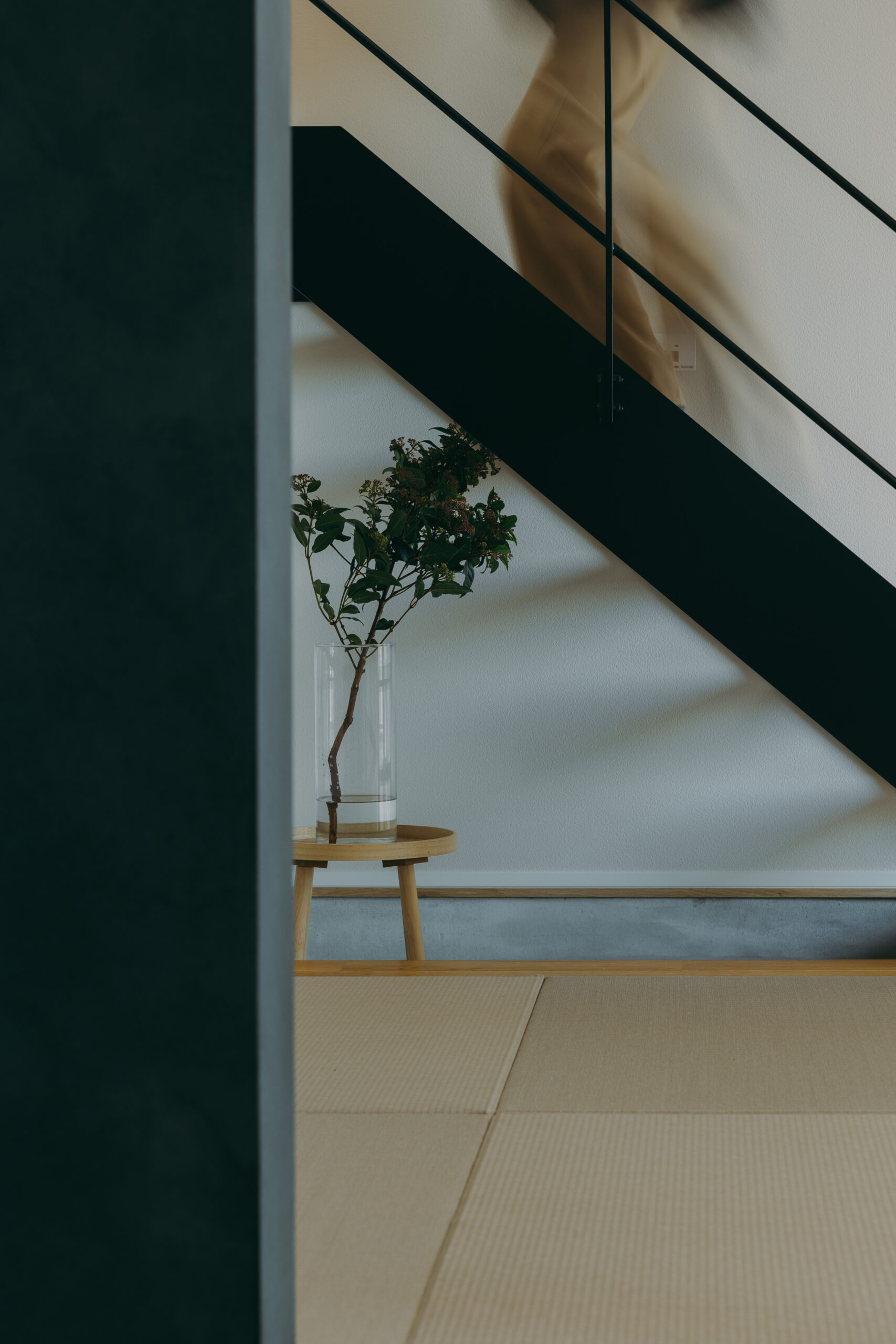 玄関の扉を開けると、そこに廊下はなく、視線の先にはLDKと吹き抜けの光が広がり、空間全体がやわらかく解き放たれる。家のどこにいても家族の気配を感じながら過ごせる。これだけ開放的な空間でありながら、外側と内側から住まいを包み込むダブル断熱によって、夏の熱気や冬の冷気を抑え、家全体を心地よい温度に保つ快適性も両立した。玄関からLDKへとつながる動線に加え、キッチンとダイニングを横並びに配置し、水回りも一直線にまとめることで、日々の動作をシンプルに整え、暮らしにゆとりをもたらしている。玄関正面にはポーターズペイントの腰壁を設け、時を重ねるごとに風合いを深めながら住まいの“顔”として空間に奥行きを添える。さらに、吹き抜けに面した書斎や、畳と土間を組み合わせた余白の空間を設けることで、つながりの中にもそれぞれが心地よく過ごせる居場所をつくり出した。仕切らないことで生まれる一体感と、それを支える確かな性能によって、家族がどこにいても安心して過ごせる住まいが完成した。